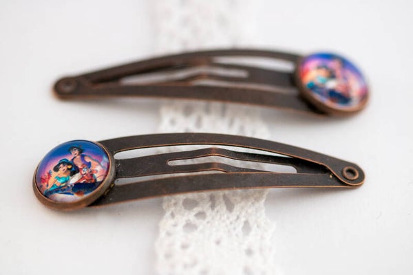 Klikspelden met een cabochon met print uit de animatiefilm 'Aladdin'. Deze zitten in een 12mm donkere koper setting.