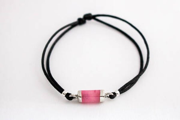 Deze fijne verstelbare armband met satijndraad is voorzien van een roze natuursteen in buisjesvorm. De armband is beschikbaar in verschillende kleuren.