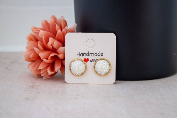 Schitterende en glinsterende witte cabochon in een 12 mm goudkleurige setting.